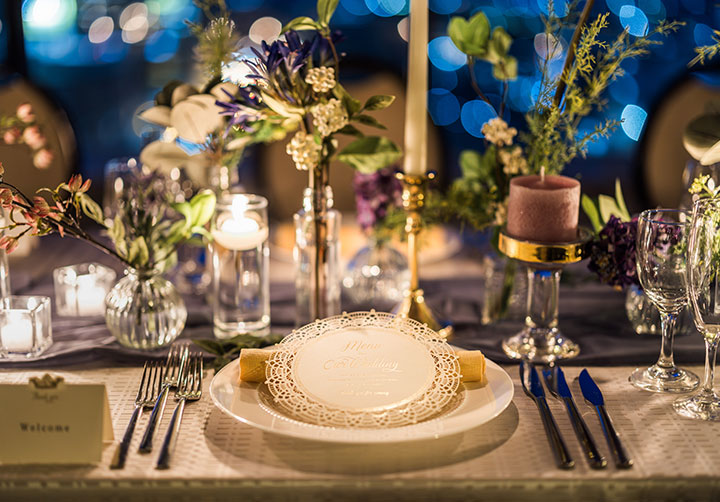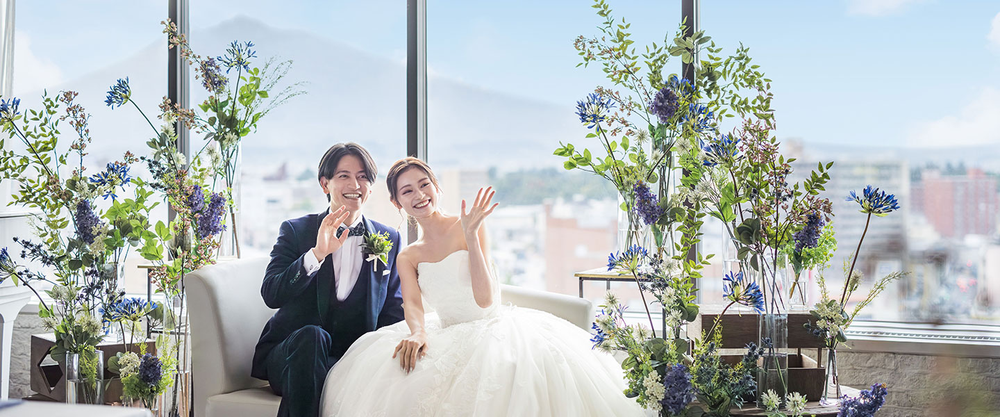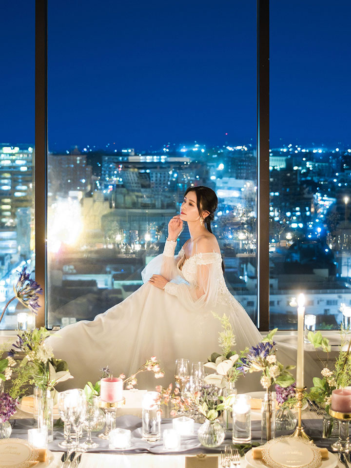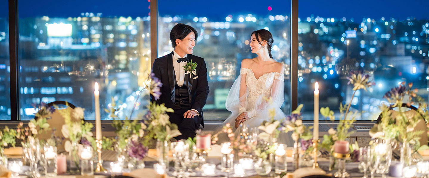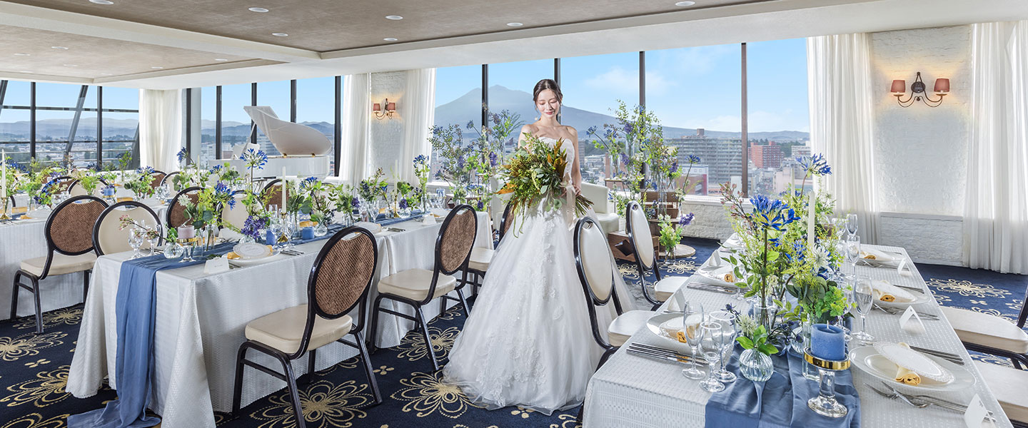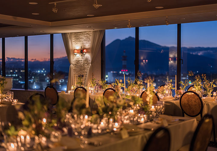 昼と夜、2つの顔を合わせもつスカイバンケットルーム「ステラ」 昼は岩木山に見守られ、自然光の中でのナチュラルなウエディングを。 夜は弘前の夜景とキャンドルの灯がまるで宝石のようにきらめく洗練された空間で ぜいたくな時間をお楽しみください。