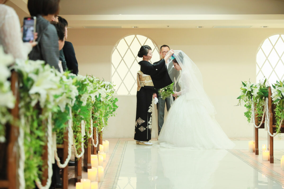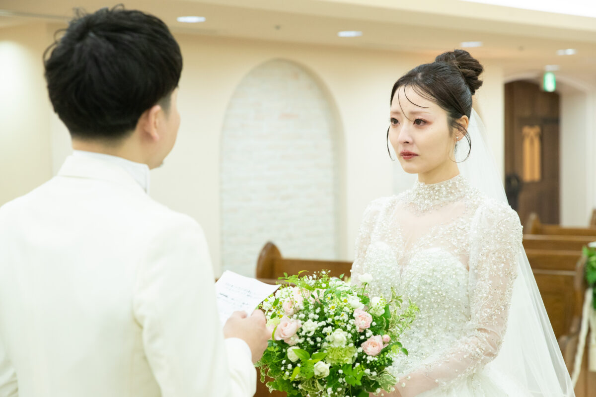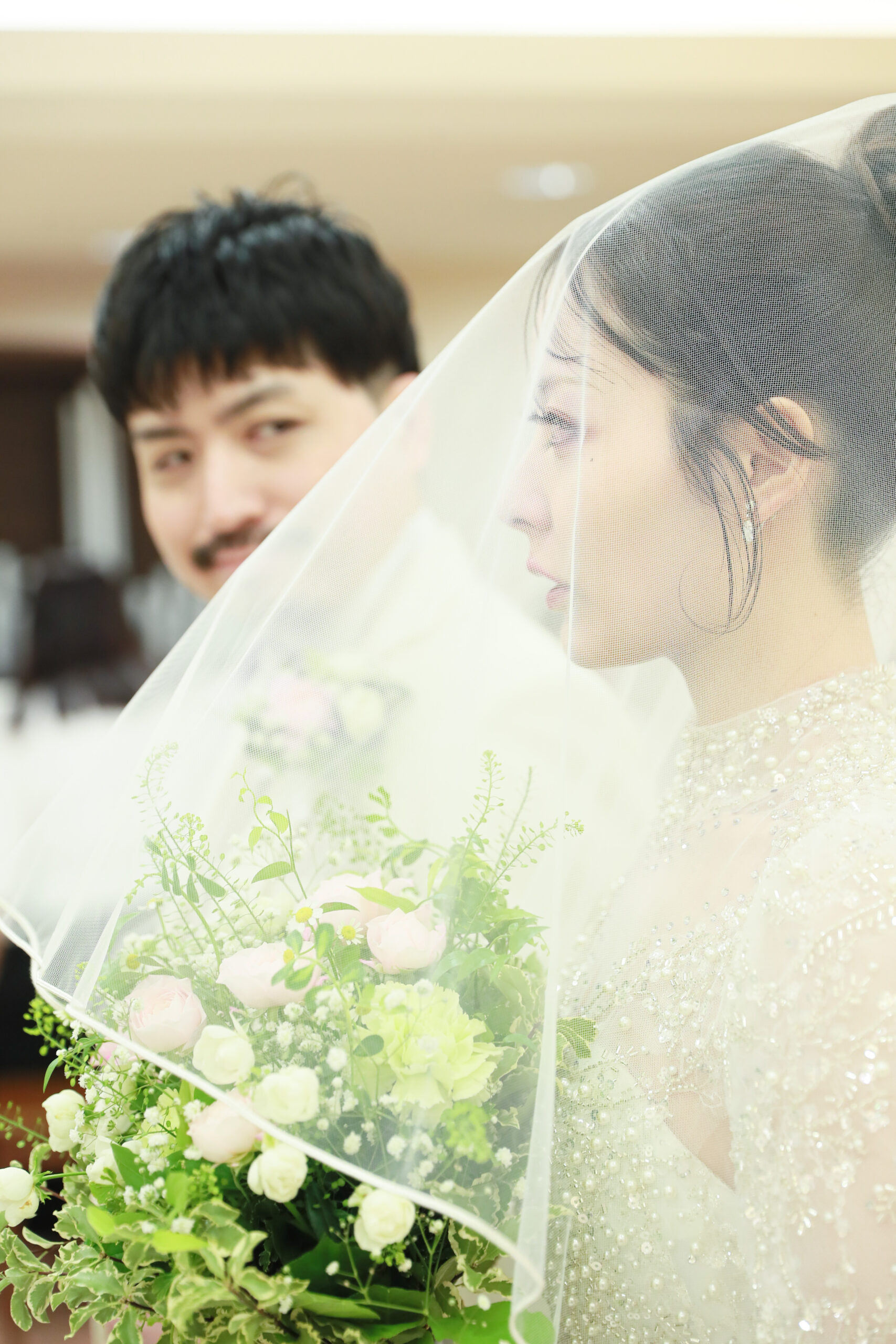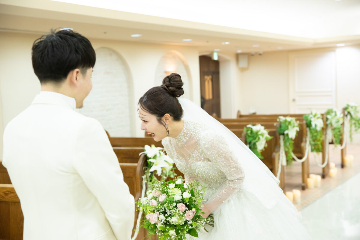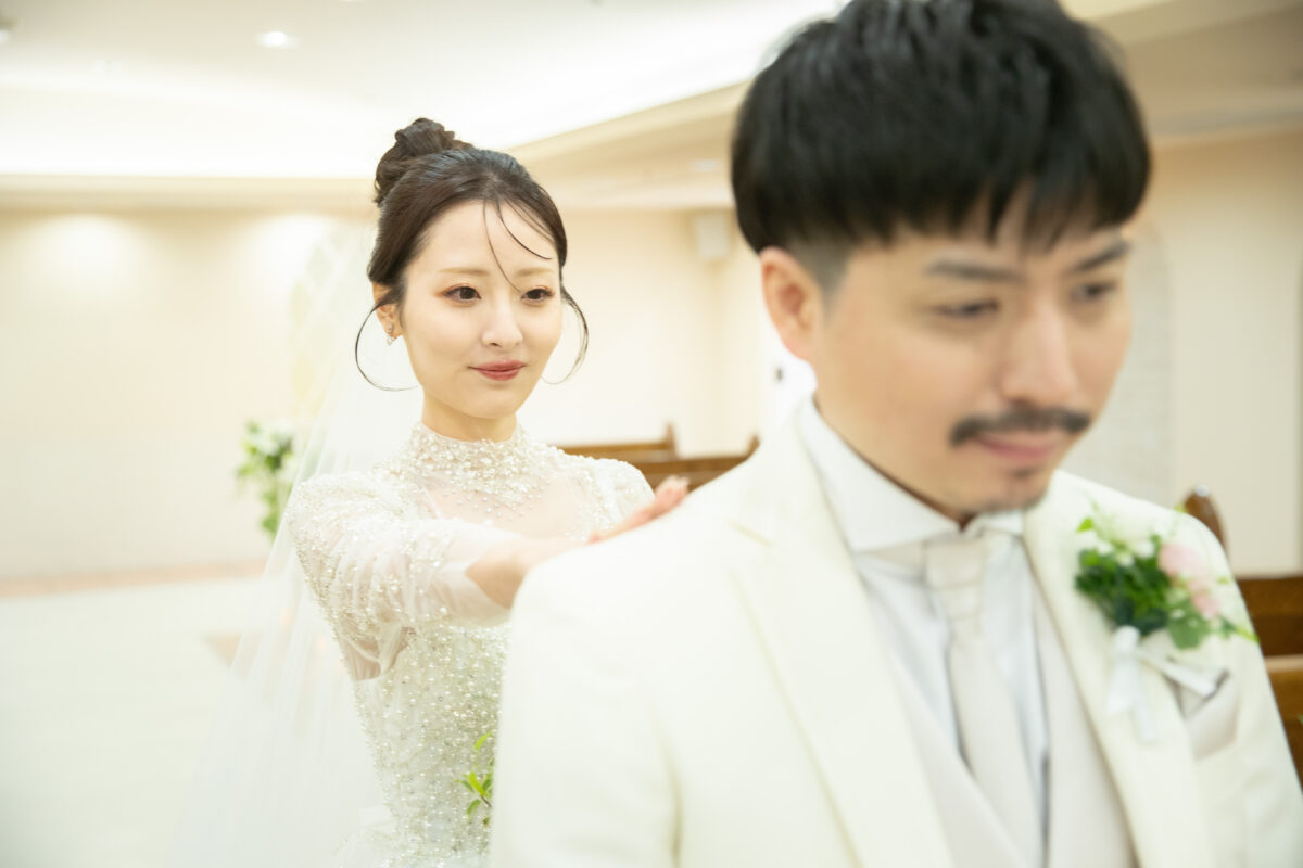 先に待つ新郎のもとへ、新婦が一歩ずつ近づき、そっと声をかけると、新郎が振り返ります