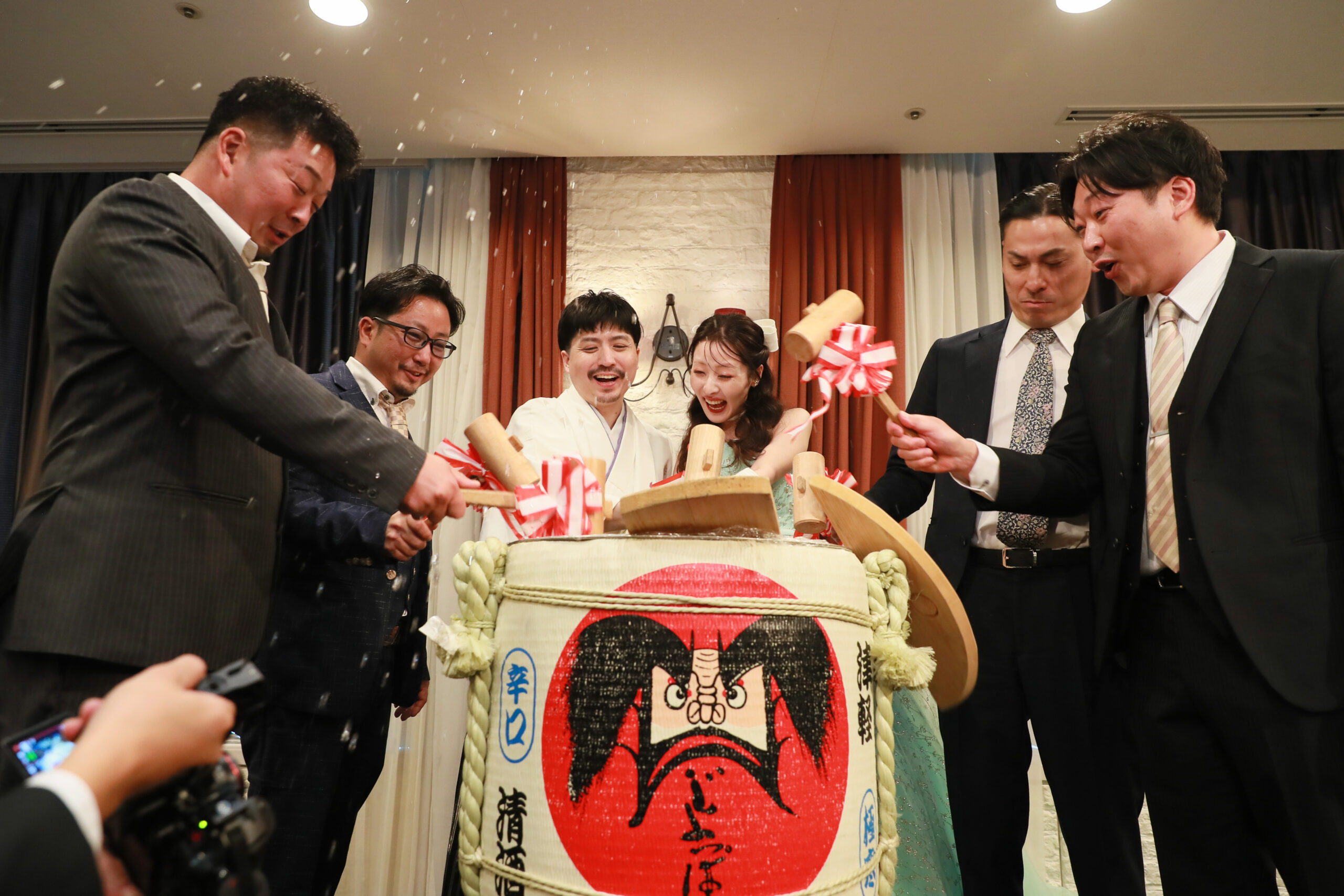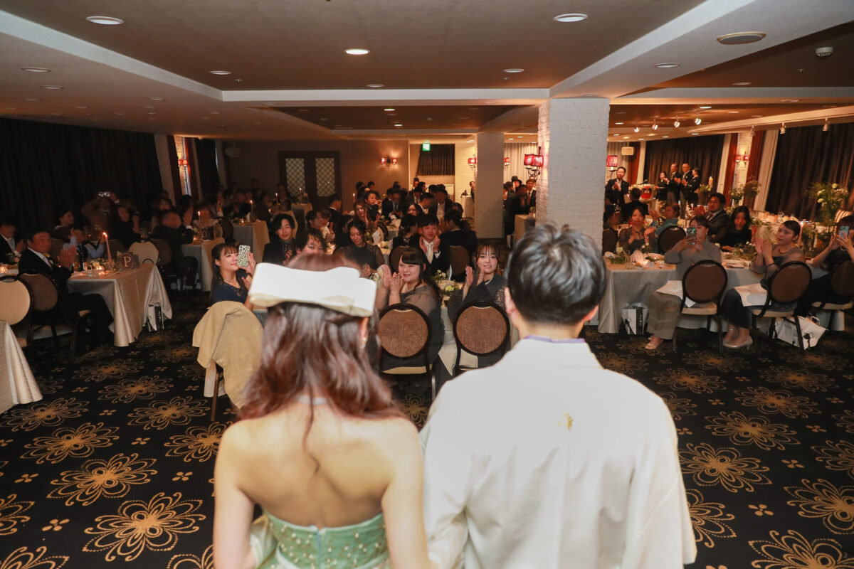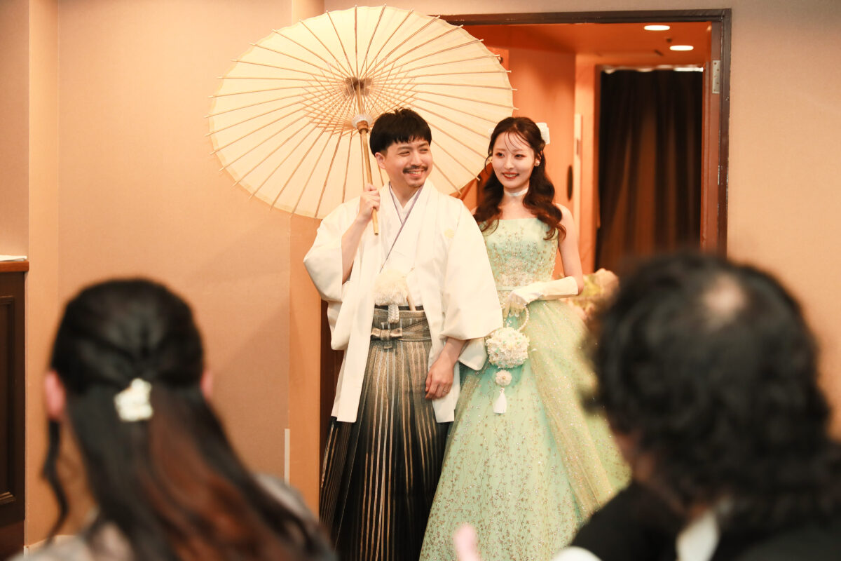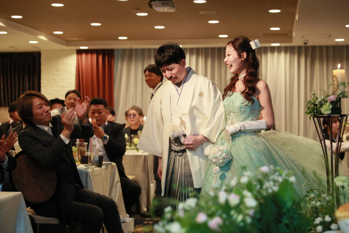 新郎は凛とした紋服姿、新婦は華やかなカラードレスで再入場