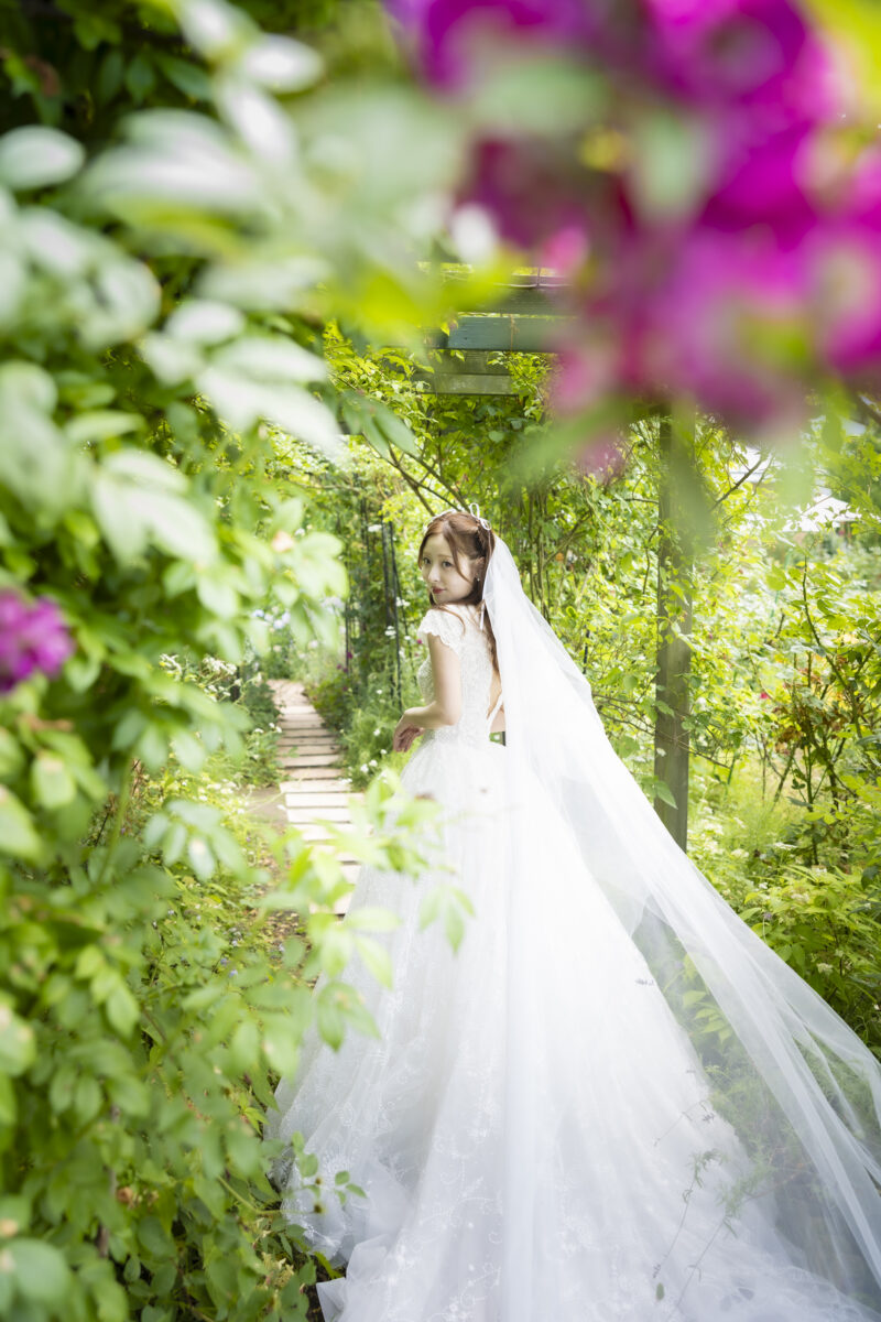 前撮りでは、猿賀神社で厳かな和装姿を、大きな栗の木の下で(ガーデン)では開放感あふれるドレス姿を撮影